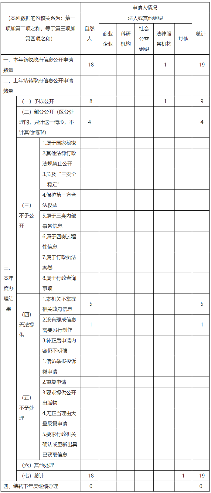 收到政府信息公開(kāi)申請19件,其中面呈申請6件,傳真申請1年,信函申請12件。對19件依申請公開(kāi)全部依法辦理。其中,同意公開(kāi)答復9件;同意部分公開(kāi)答復4件;不屬于本機關(guān)公開(kāi)5件;申請信息不存在1件;告知通過(guò)其他途徑辦理8件。全年未收取任何費用。