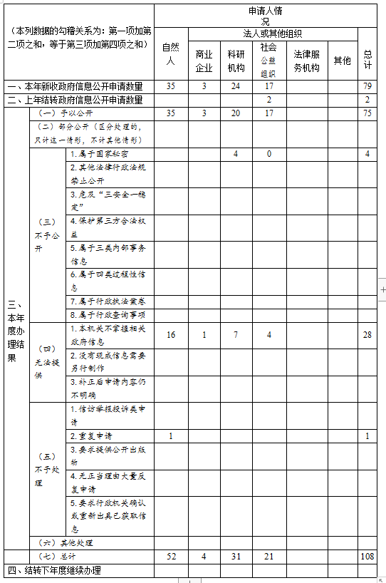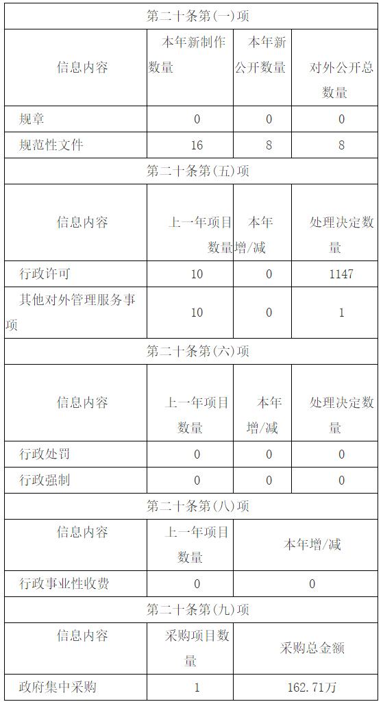 本年度報告根據《中華人民共和國政府信息公開(kāi)條例》(國務(wù)院令第711號)(以下簡(jiǎn)稱(chēng)“條例”)編制,由總體情況、主動(dòng)公開(kāi)政府信息情況、收到和處理政府信息公開(kāi)申請情況、政府信息公開(kāi)行政復議和行政訴訟情況、存在的主要問(wèn)題及改進(jìn)情況、其他需要報告的事項六個(gè)部分組成。