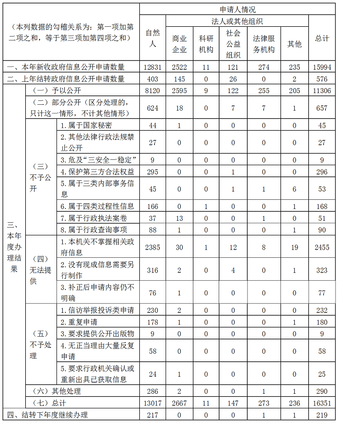 (二)依法辦理政府信息公開(kāi)申請。各級各部門(mén)堅持合法、便民的原則,對公民、法人和其他組織申請公開(kāi)政府信息能提供的積極提供,不能提供的依法做好答復說(shuō)明。2019年全省共收到依申請公開(kāi)件15994件,上年度結轉辦理件576件,共辦理完成16351件,結轉到2020年辦理219件。其中,省政府辦公廳(政務(wù)局)2019年收到依申請公開(kāi)235件,辦理完成225件,結轉到2020年辦理10件;發(fā)生行政復議1件,暫未審結;發(fā)生行政訴訟5件,已經(jīng)審結4件,沒(méi)有發(fā)生敗訴情形。