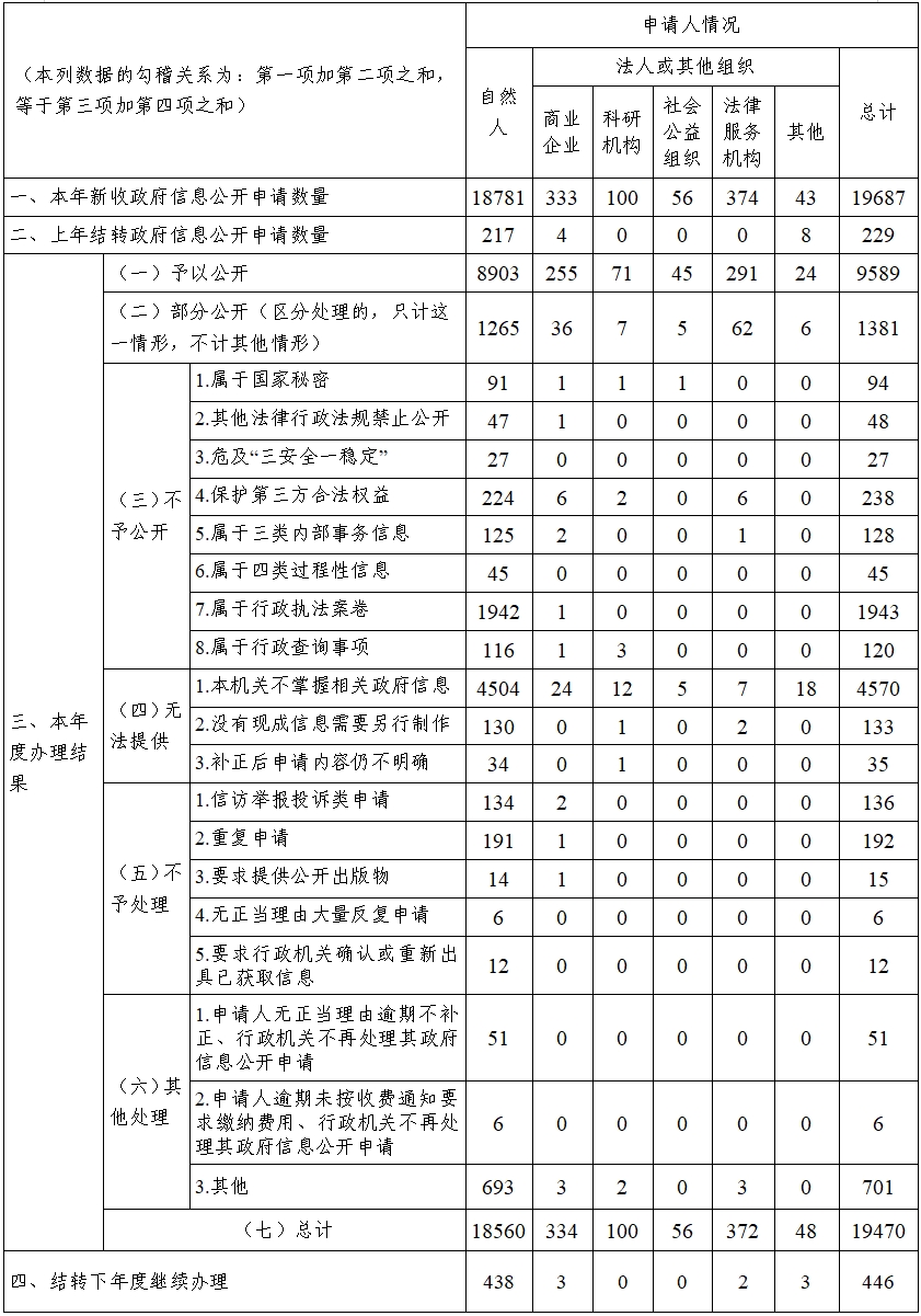 (二)依申請公開(kāi)情況。全省各級各部門(mén)認真貫徹執行政府信息公開(kāi)條例有關(guān)依申請公開(kāi)規定,依法依規辦理政府信息公開(kāi)申請件,并堅持便民原則,滿(mǎn)足企業(yè)群眾個(gè)性化、合理化需求。2023年全省共收到依申請公開(kāi)件19687件,上年度結轉辦理件229件,共辦理完成19470件,結轉到2024年辦理446件。其中,省政府辦公廳(省數據局)2023年收到政府信息公開(kāi)申請375件,結轉上年度政府信息公開(kāi)申請5件,共辦理完成379件,結轉下年度繼續辦理1件;發(fā)生行政復議7件,其中4件維持;發(fā)生行政訴訟5件,全部維持。