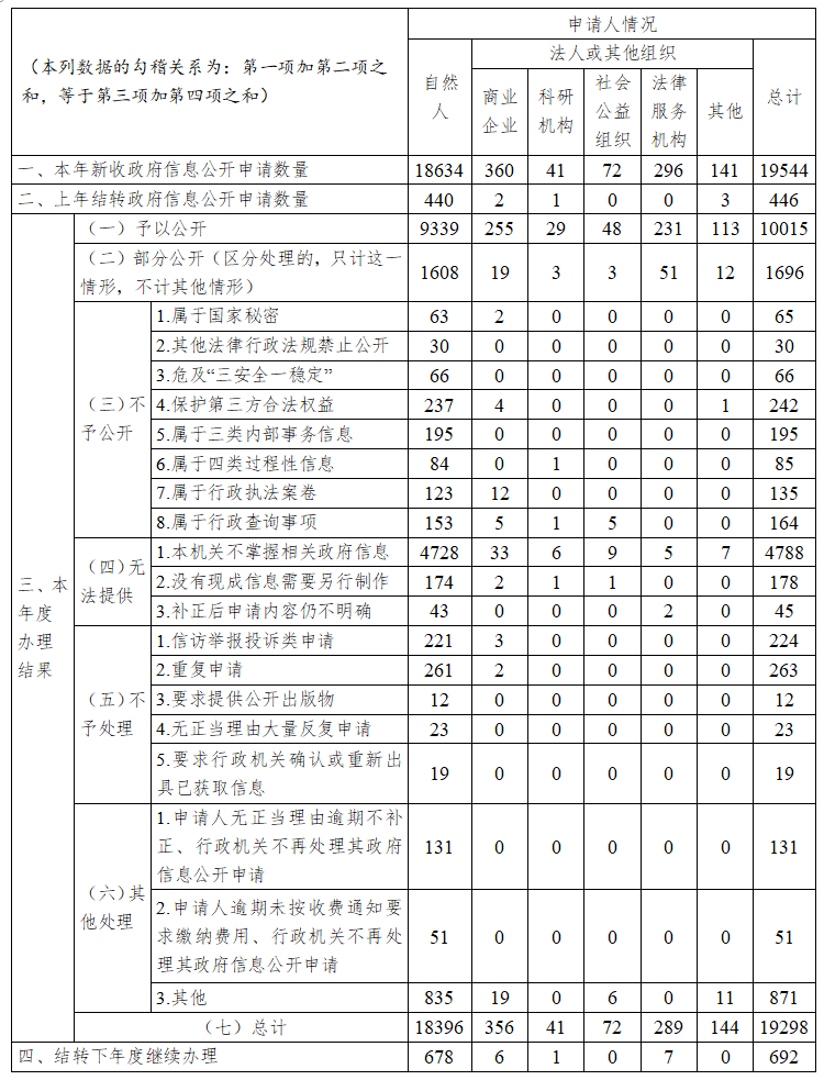 (二)依申請公開(kāi)情況。暢通依申請公開(kāi)受理渠道,建立完善“湖南省政府信息依申請公開(kāi)辦理平臺”,為申請人依法申請獲取政府信息提供便利。指導各級各部門(mén)進(jìn)一步規范辦理政府信息公開(kāi)申請,嚴格執行政府信息公開(kāi)申請接收、登記、審查、辦理、答復、送達、歸檔等要求,不斷強化服務(wù)意識,提高辦理質(zhì)效。印發(fā)《關(guān)于做好省人民政府批準建設用地批準文件信息依申請公開(kāi)答復工作的通知》,進(jìn)一步規范有關(guān)征地審批信息依申請公開(kāi)辦理答復的主體和程序。2024年全省共收到依申請公開(kāi)件19544件,上年度結轉辦理件446件,共辦理完成19298件,結轉下年度繼續辦理692件。其中,省政府和省政府辦公廳2024年共收到政府信息公開(kāi)申請672件,結轉上年度政府信息公開(kāi)申請1件,共辦理完成625件,結轉下年度繼續辦理48件;發(fā)生行政復議10件、行政訴訟1件。