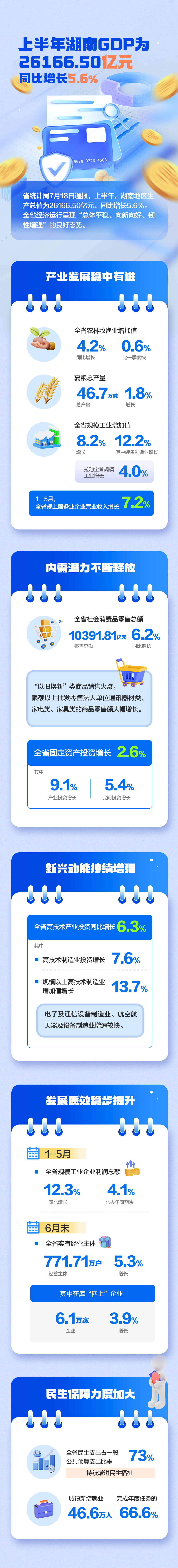 上半年湖南GDP為26166.50億元 同比增長(cháng)5.6%