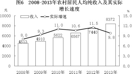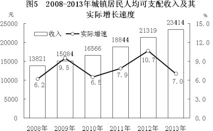 全省城鎮居民人均可支配收入23414元,比上年增長(cháng)9.8%;扣除價(jià)格因素,實(shí)際增長(cháng)7.0%;農村居民人均純收入8372元,增長(cháng)12.5%;扣除價(jià)格因素,實(shí)際增長(cháng)9.8%。城鎮居民人均消費性支出15887元,增長(cháng)8.7%;農村居民人均生活消費支出6609元,增長(cháng)12.6%。城鎮居民食品消費支出占消費總支出的比重(恩格爾系數)為35.1%,農村為38.4%。
