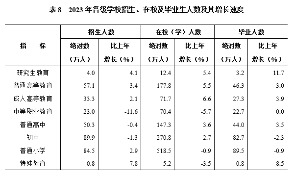 年末有普通高校123所。研究生教育畢業(yè)生3.2萬(wàn)人,普通高等教育畢業(yè)生46.3萬(wàn)人,中等職業(yè)教育畢業(yè)生22.7萬(wàn)人,普通高中畢業(yè)生44.0萬(wàn)人,初中畢業(yè)生82.7萬(wàn)人,普通小學(xué)畢業(yè)生89.5萬(wàn)人。在園幼兒183.7萬(wàn)人,比上年下降15.0%。小學(xué)適齡兒童入學(xué)率[13]100%,高中階段教育毛入學(xué)率[14] 94.77%。各類(lèi)民辦學(xué)校9932所,在校學(xué)生216.9萬(wàn)人。發(fā)放高校國家獎學(xué)金、助學(xué)金(本專(zhuān)科生)14.5億元,資助高校學(xué)生(本專(zhuān)科生)76.9萬(wàn)人次。發(fā)放中職國家助學(xué)金5.2億元,資助中職學(xué)生52.2萬(wàn)人次。落實(shí)義務(wù)教育保障資金113.4億元,發(fā)放普通高中國家助學(xué)金5.6億元。