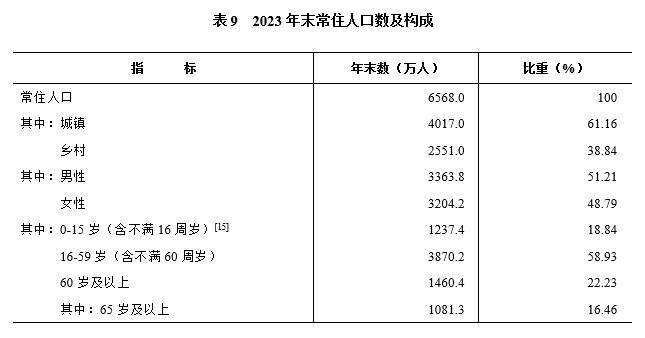 年末全省常住人口6568萬(wàn)人。其中,城鎮人口4017萬(wàn)人,城鎮化率61.16%,比上年末提高0.85個(gè)百分點(diǎn)。全年出生人口39.5萬(wàn)人,出生率6.00‰;死亡人口59.8萬(wàn)人,死亡率9.08‰;人口自然增長(cháng)率-3.08‰。0-15歲(含不滿(mǎn)16周歲)人口占常住人口的比重為18.84%,下降0.68個(gè)百分點(diǎn);16-59歲(含不滿(mǎn)60周歲)人口比重為58.93%,下降0.72個(gè)百分點(diǎn);60歲及以上人口比重為22.23%,提高1.39個(gè)百分點(diǎn)。