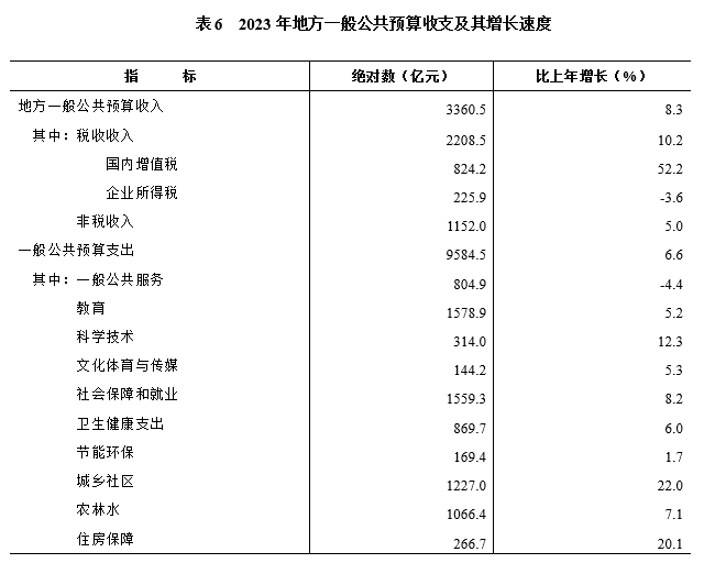 全年地方一般公共預算收入3360.5億元,比上年增長(cháng)8.3%。其中,稅收收入2208.5億元,增長(cháng)10.2%;非稅收入1152.0億元,增長(cháng)5.0%。稅收收入中,國內增值稅824.2億元,增長(cháng)52.2%;企業(yè)所得稅225.9億元,下降3.6%。一般公共預算支出9584.5億元,增長(cháng)6.6%。其中,教育支出1578.9億元,增長(cháng)5.2%;社會(huì )保障和就業(yè)支出1559.3億元,增長(cháng)8.2%;衛生健康支出869.7億元,增長(cháng)6.0%;科學(xué)技術(shù)支出314.0億元,增長(cháng)12.3%;住房保障支出266.7億元,增長(cháng)20.1%。