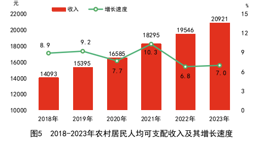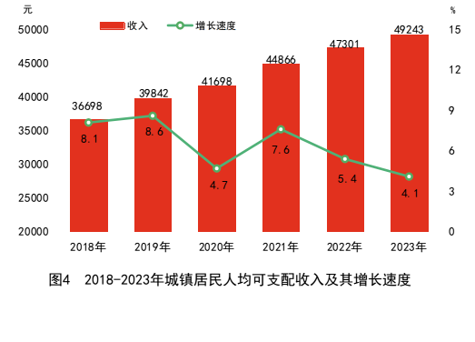 全年全省居民人均可支配收入35895元,比上年增長(cháng)5.5%;居民人均可支配收入中位數28606元,增長(cháng)4.4%。按常住地分,城鎮居民人均可支配收入49243元,增長(cháng)4.1%;城鎮居民人均可支配收入中位數43705元,增長(cháng)3.0%。農村居民人均可支配收入20921元,增長(cháng)7.0%;農村居民人均可支配收入中位數18585元,增長(cháng)5.7%。城鄉居民收入比由上年的2.42縮小為2.35。分區域看,長(cháng)株潭地區全體居民人均可支配收入54069元,增長(cháng)4.4%;湘南地區全體居民人均可支配收入33228元,增長(cháng)5.5%;大湘西地區全體居民人均可支配收入25110元,增長(cháng)6.3%;洞庭湖地區全體居民人均可支配收入32744元,增長(cháng)5.4%。脫貧縣[16]農村居民人均可支配收入16036元,增長(cháng)9.0%。