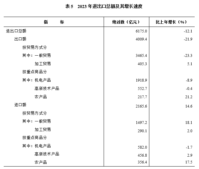 全年進(jìn)出口總額[11]6175.0億元,比上年下降12.1%。其中,出口4009.4億元,下降21.9%;進(jìn)口2165.6億元,增長(cháng)14.6%。分貿易方式看,一般貿易出口3465.4億元,下降23.3%;加工貿易出口405.3億元,增長(cháng)5.1%。重點(diǎn)出口商品中,機電產(chǎn)品1918.9億元,下降8.9%;高新技術(shù)產(chǎn)品552.7億元,下降0.4%。分產(chǎn)銷(xiāo)國別(地區)看,出口美國449.7億元,下降37.9%;出口中國香港536.8億元,增長(cháng)3.1%;出口歐盟[12]355.5億元,下降29.4%;出口東盟761.8億元,下降34.2%;出口共建“一帶一路”國家2181.8億元,下降18.7%。