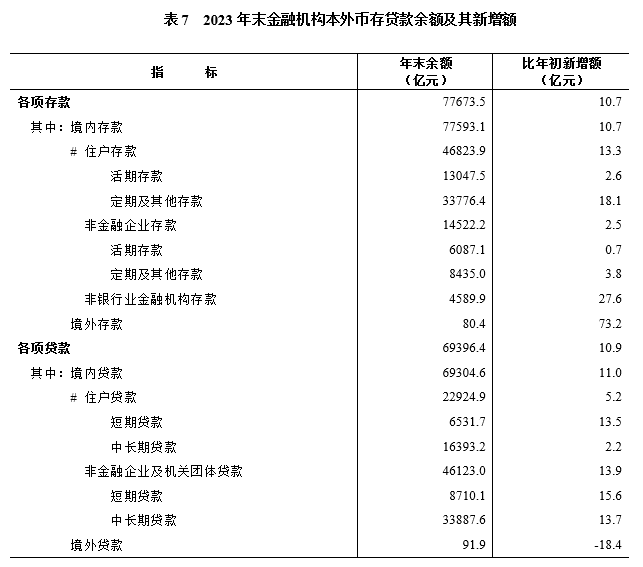 年末金融機構本外幣各項存款余額77673.5億元,比上年末增長(cháng)10.7%。其中,住戶(hù)存款余額46823.9億元,增長(cháng)13.3%;非金融企業(yè)存款余額14522.2億元,增長(cháng)2.5%。本外幣各項貸款余額69396.4億元,增長(cháng)10.9%。其中,住戶(hù)貸款余額22924.9億元,增長(cháng)5.2%;非金融企業(yè)及機關(guān)團體貸款余額46123.0億元,增長(cháng)13.9%。