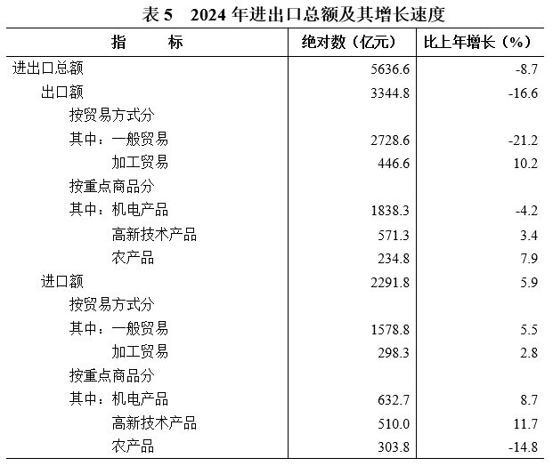 全年進(jìn)出口總額[21]5636.6億元,比上年下降8.7%。其中,出口3344.8億元,下降16.6%;進(jìn)口2291.8億元,增長(cháng)5.9%。分貿易方式看,一般貿易出口2728.6億元,下降21.2%;加工貿易出口446.6億元,增長(cháng)10.2%。重點(diǎn)出口商品中,機電產(chǎn)品1838.3億元,下降4.2%;高新技術(shù)產(chǎn)品571.3億元,增長(cháng)3.4%。分產(chǎn)銷(xiāo)國別(地區)看,出口美國314.6億元,下降30.1%;出口中國香港463.0億元,下降13.7%;出口歐盟[22]326.1億元,下降8.3%;出口東盟599.4億元,下降21.3%;出口共建“一帶一路”[23]國家1879.4億元,下降16.0%。
