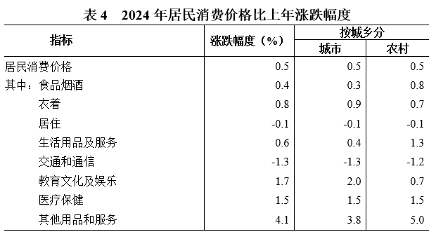 全省居民消費價(jià)格比上年上漲0.5%。其中,城市上漲0.5%,農村上漲0.5%。工業(yè)生產(chǎn)者出廠(chǎng)價(jià)格下降0.7%,工業(yè)生產(chǎn)者購進(jìn)價(jià)格下降2.4%。農產(chǎn)品生產(chǎn)者價(jià)格上漲3.3%。