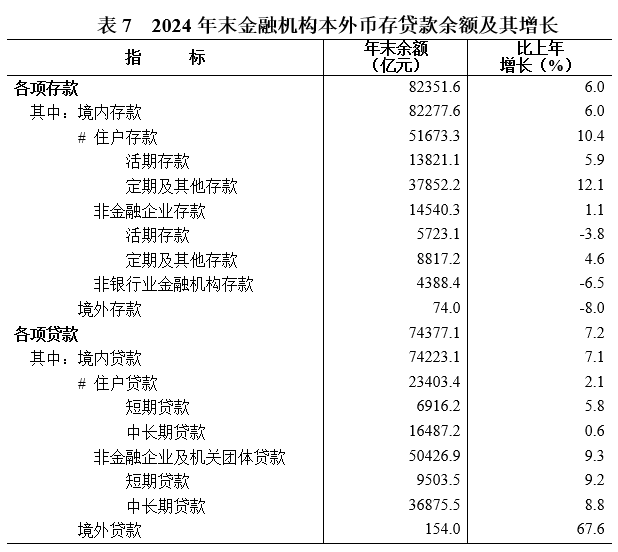 年末金融機構本外幣各項存款余額82351.6億元,比上年末增長(cháng)6.0%。其中,住戶(hù)存款余額51673.3億元,增長(cháng)10.4%;非金融企業(yè)存款余額14540.3億元,增長(cháng)1.1%。本外幣各項貸款余額74377.1億元,增長(cháng)7.2%。其中,住戶(hù)貸款余額23403.4億元,增長(cháng)2.1%;非金融企業(yè)及機關(guān)團體貸款余額50426.9億元,增長(cháng)9.3%。