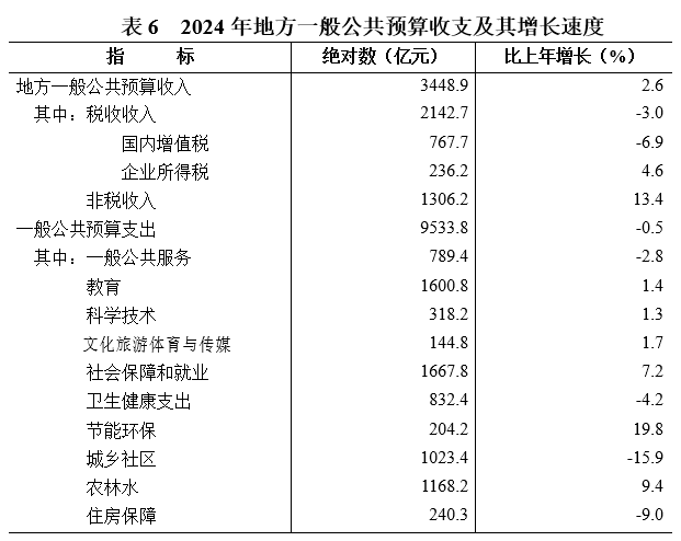 全年地方一般公共預算收入3448.9億元,比上年增長(cháng)2.6%。其中,稅收收入2142.7億元,下降3.0%;非稅收入1306.2億元,增長(cháng)13.4%。稅收收入中,國內增值稅767.7億元,下降6.9%;企業(yè)所得稅236.2億元,增長(cháng)4.6%。一般公共預算支出9533.8億元,下降0.5%。其中,教育支出1600.8億元,增長(cháng)1.4%;社會(huì )保障和就業(yè)支出1667.8億元,增長(cháng)7.2%;衛生健康支出832.4億元,下降4.2%;科學(xué)技術(shù)支出318.2億元,增長(cháng)1.3%;住房保障支出240.3億元,下降9.0%。