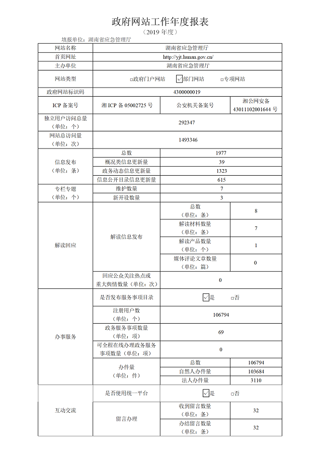 2019年湖南省應急管理廳網(wǎng)站工作年度報表