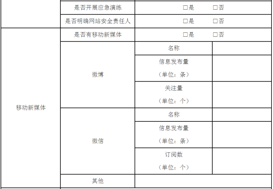 1.是否有移動(dòng)新媒體:網(wǎng)站主辦單位是否保障移動(dòng)新媒體,請勾選“是”或“否”。如勾選“是”,請填寫(xiě)“微博”、“微信”、“其他”項目。