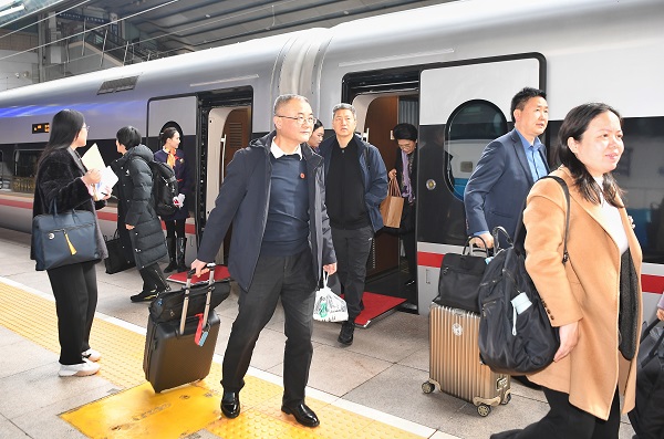 3月3日下午,出席十四屆全國人大三次會(huì )議的部分在湘全國人大代表乘高鐵抵達北京,向大會(huì )報到。 湖南日報全媒體記者 唐俊 傅聰 易昂 攝