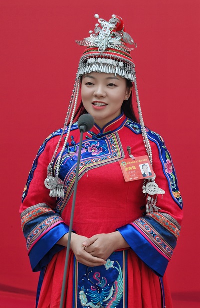 “我是來(lái)自郴州桂東的畬族青年,我身上穿的就是畬族傳統服飾鳳凰裝?!痹凇拔瘑T通道”上,省政協(xié)委員、郴州桂東縣藍老爹茶業(yè)開(kāi)發(fā)有限公司總經(jīng)理藍利麗驕傲地展示。