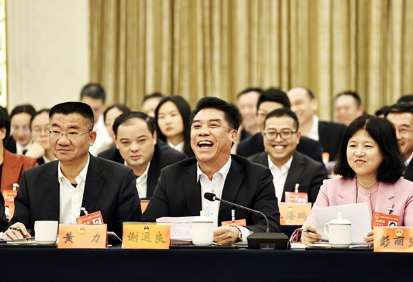 “這個(gè)建議很重要,莽山是旅游勝地,就差一個(gè)高鐵站?!?月14日下午,郴州市代表團謝運良代表(前排中)在發(fā)言中提出建議,希望宜章也能享受高鐵交通帶來(lái)的便利,引得現場(chǎng)代表會(huì )心歡笑。湖南日報全媒體記者 劉尚文 攝