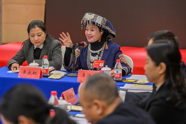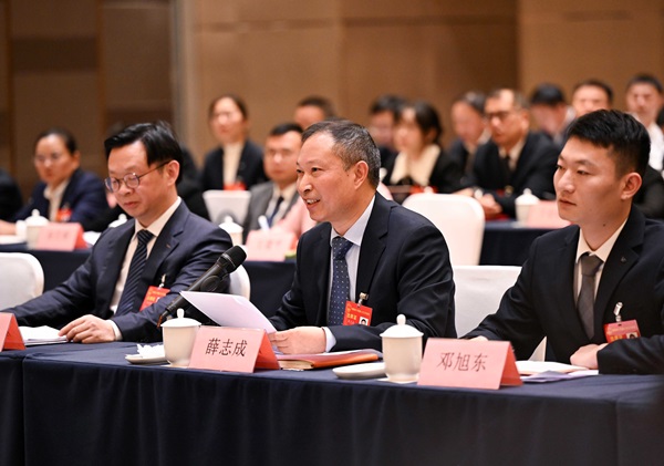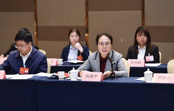 1月16日,懷化市代表團向建平代表(前排右)在審議“兩院”工作報告時(shí)發(fā)言。湖南日報全媒體記者 辜鵬博 攝
