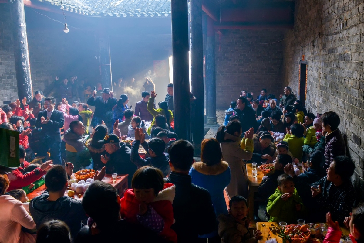 2016年2月8日8時(shí)。大年初一,衡東縣榮桓鎮肖家新屋全村人聚在肖家老祠堂一起過(guò)大年。