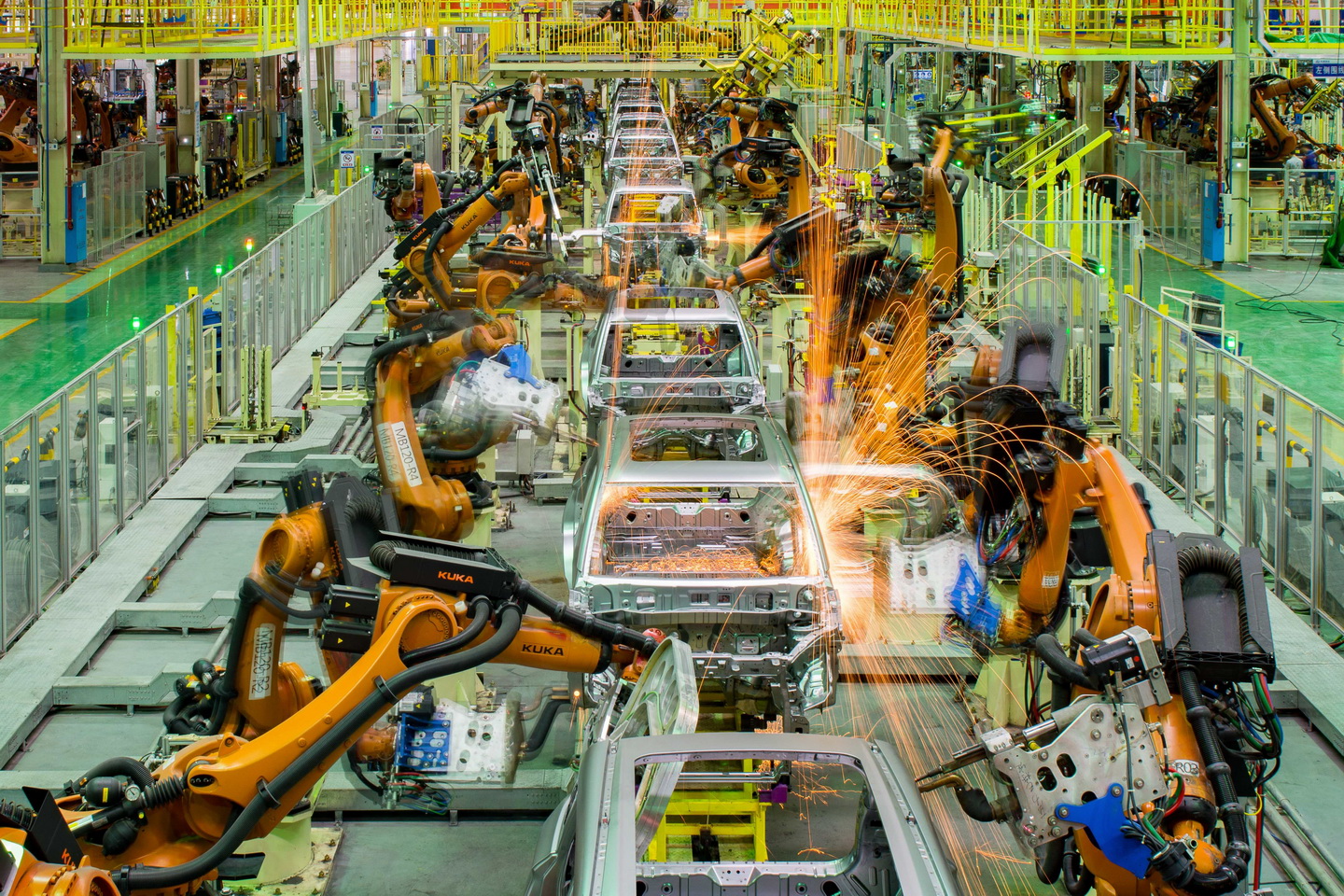 獵豹汽車(chē)長(cháng)沙公司焊裝車(chē)間自動(dòng)化生產(chǎn)線(xiàn)上,機器人靈活、準確地焊接車(chē)身。