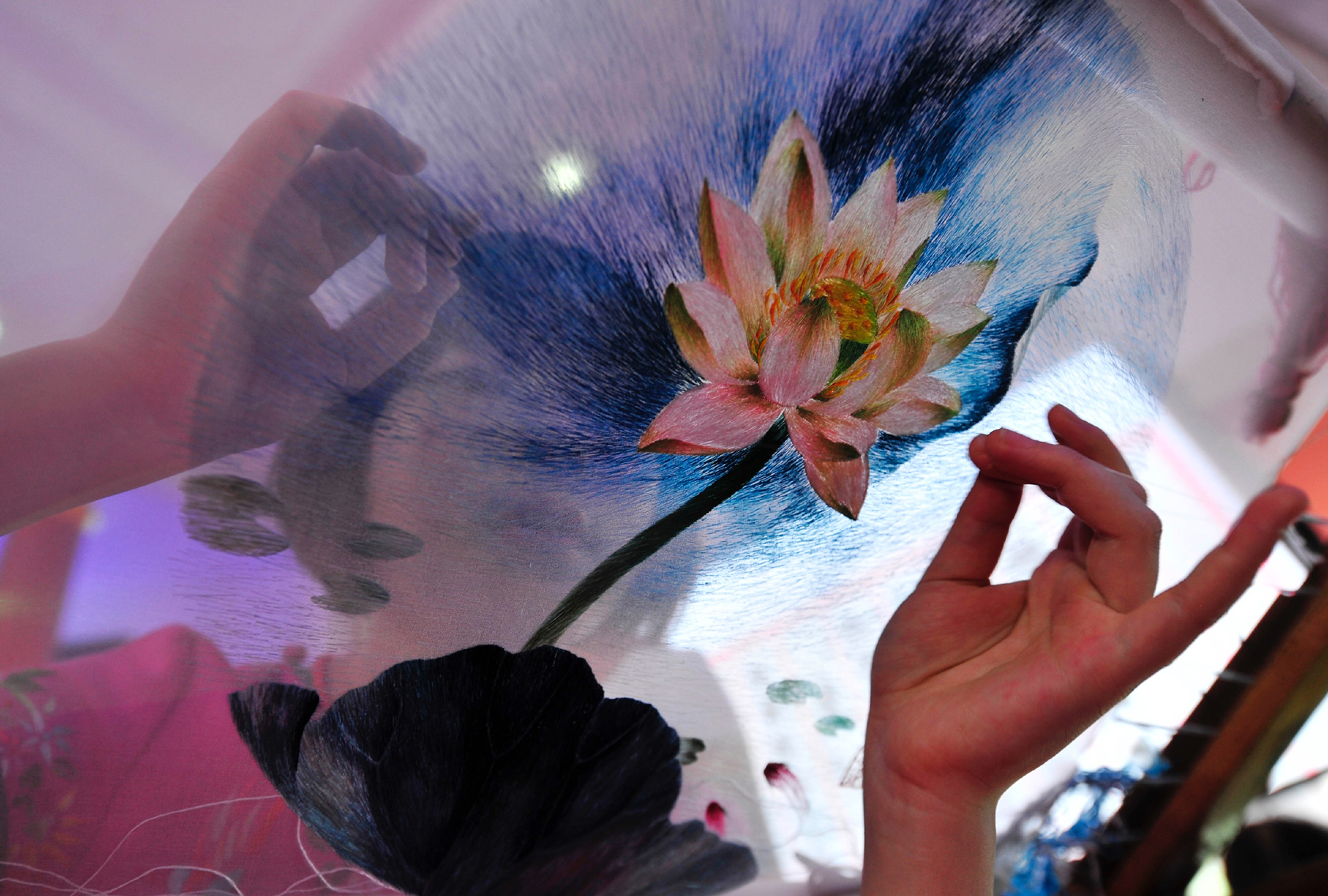 2012年9月15日,一位繡女在現場(chǎng)演示湘繡制作。當天,第二屆中國湘繡文化藝術(shù)節、中國當代刺繡藝術(shù)品大展、第四屆湖南省工藝美術(shù)品博覽會(huì )在省展覽館開(kāi)幕。