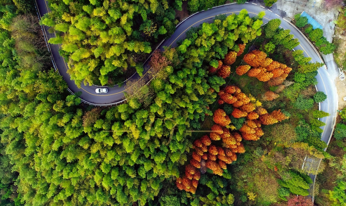 南岳西嶺鄉間公路上,西嶺為南岳登山起點(diǎn)之一,沿途山路彎彎、景色優(yōu)美,有得天獨厚的植被、水系等資源,更有黃庭觀(guān)、十里茶鄉、“南岳四絕”之一的“方廣寺之深”、原始次生林等景點(diǎn),平均海拔在800米以上。駕車(chē)行駛在路上,當翠綠的竹林才開(kāi)始微微帶黃的時(shí)候,旁邊的水杉已經(jīng)告訴你:秋天到了。