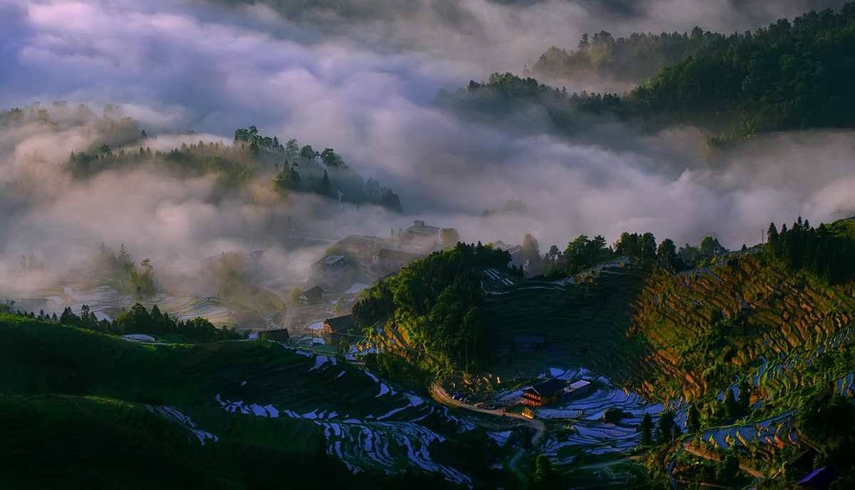 新化紫鵲界屬于雪峰山中部的奉家山體系,最高峰海拔1585.2m。從海拔500m到1200m之間,共500余級梯田,坡度一般在30-50度,初墾于秦朝。