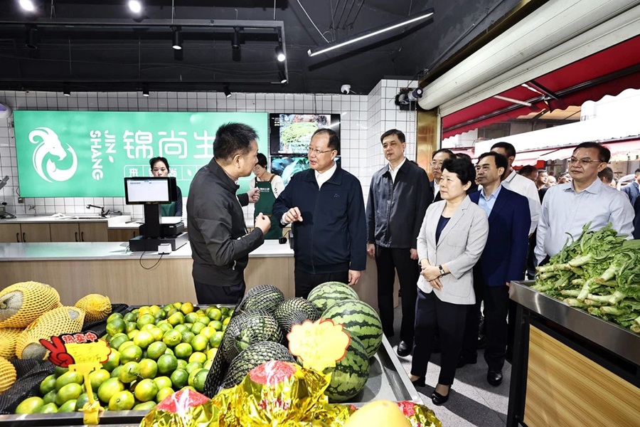 錦尚生鮮市場(chǎng)是長(cháng)沙市最大的零售農貿市場(chǎng),占地面積近1.5萬(wàn)平方米,擁有380多個(gè)攤位,新鮮蔬菜、應季水果、海鮮水產(chǎn)等一應俱全?!笆卟藘r(jià)格還穩定嗎?”“豬肉是從哪兒進(jìn)貨?”毛偉明來(lái)到熟食、蔬菜、豬肉等多個(gè)攤位前,與忙碌的攤主和顧客親切交流,并參觀(guān)食品安全快檢室,詳細詢(xún)問(wèn)貨源渠道、銷(xiāo)量?jì)r(jià)格、質(zhì)量檢測等情況。毛偉明強調,要加強節日熱銷(xiāo)食品、大宗食品和重點(diǎn)領(lǐng)域監管,健全完善從“田間地頭”到“百姓餐桌”的全過(guò)程食品安全追溯體系,進(jìn)一步規范生產(chǎn)經(jīng)營(yíng)行為,營(yíng)造安全放心的食品消費環(huán)境,確保節日期間“米袋子”“菜籃子”“果盤(pán)子”質(zhì)優(yōu)量足價(jià)穩,守護好群眾“舌尖上的安全”。
