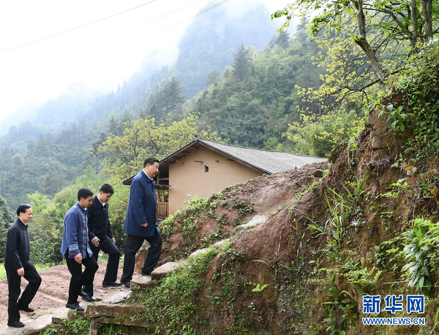 2019年4月15日至17日,習近平在重慶主持召開(kāi)解決“兩不愁三保障”突出問(wèn)題座談會(huì )。這是4月15日下午,在石柱土家族自治縣中益鄉華溪村,習近平踏著(zhù)濕滑的上坡石階,前往貧困戶(hù)譚登周家看望。 新華社記者 謝環(huán)馳 攝