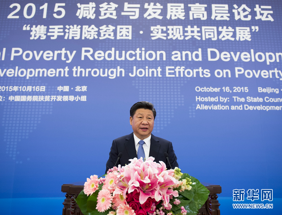 2015年10月16日,習近平在北京出席2015減貧與發(fā)展高層論壇并發(fā)表題為《攜手消除貧困 促進(jìn)共同發(fā)展》的主旨演講,強調消除貧困是人類(lèi)的共同使命。改革開(kāi)放30多年來(lái),中國走出了一條中國特色減貧道路。中國在致力于自身消除貧困的同時(shí),積極展開(kāi)南南合作,同舟共濟,攻堅克難,支持和幫助廣大發(fā)展中國家特別是最不發(fā)達國家消除貧困,為各國人民帶來(lái)更多福祉。 新華社記者 李學(xué)仁 攝