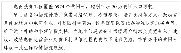加強貧困地區互聯(lián)網(wǎng)和物流基礎設施建設。實(shí)施貧困地區中小城市基礎設施網(wǎng)絡(luò )完善工程,推進(jìn)貧困縣骨干網(wǎng)、城域網(wǎng)擴容提速以及光網(wǎng)化改造,優(yōu)化寬帶網(wǎng)絡(luò )結構和性能,提升信息化扶貧能力。建設精準扶貧大數據平臺,實(shí)施"互聯(lián)網(wǎng)+精準扶貧"工程。支持在武陵山、羅霄山等貧困地區省際邊界城鎮建設一批商貿物流中心,形成輻射面寬、帶動(dòng)力強的區域物流節點(diǎn)。支持貧困地區建設一批區域性倉儲配送基地。扶持農產(chǎn)品冷鏈物流基礎設施建設,完善產(chǎn)業(yè)預冷、銷(xiāo)地冷藏和保鮮運輸、保鮮加工等設施,努力實(shí)現農產(chǎn)品冷鏈物流全覆蓋。支持貧困地區物流通道、園區、口岸、配送中心等基礎設施建設,增強區域物流節點(diǎn)綜合服務(wù)功能。