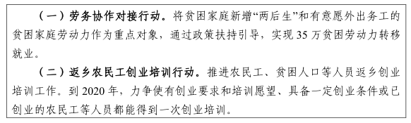 加大勞務(wù)輸出培訓。統籌各類(lèi)培訓資源,將貧困家庭勞動(dòng)力納入轉移就業(yè)培訓對象范疇,以就業(yè)為導向,在貧困家庭勞動(dòng)力輸出地和輸入地及時(shí)組織各類(lèi)培訓,到2020年實(shí)現農村貧困人口轉移就業(yè)約70萬(wàn)人。加大對貧困婦女的職業(yè)技能培訓和就業(yè)指導服務(wù),推進(jìn)巾幗家政服務(wù)專(zhuān)項培訓工程,提高婦女參與產(chǎn)業(yè)發(fā)展脫貧致富的能力。