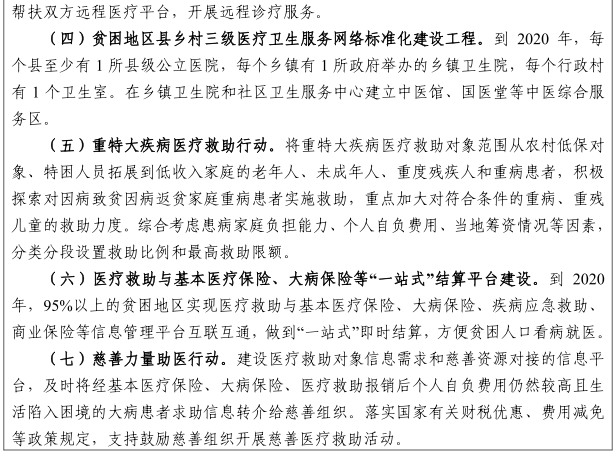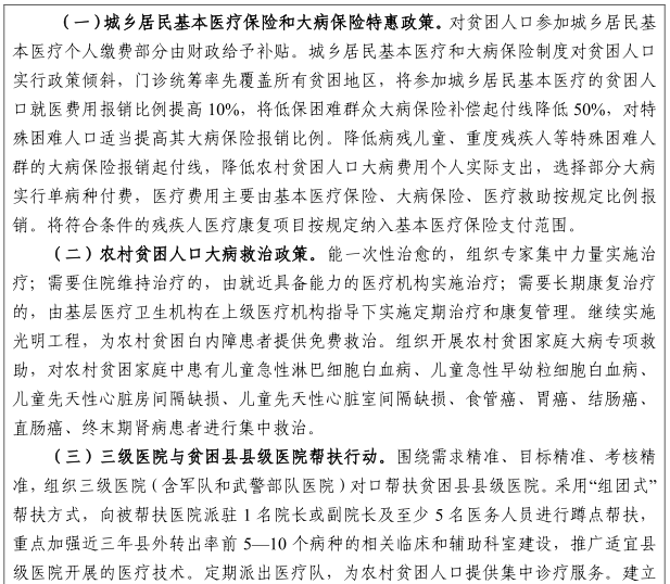 加大醫療保險與救助保障力度。對貧困人口參加城鄉居民基本醫療保險個(gè)人繳費部分由財政通過(guò)城鄉醫療救助給予補貼。城鄉居民基本醫療和大病保險制度對貧困人口實(shí)行政策傾斜,門(mén)診統籌率先覆蓋所有貧困地區,提高政策范圍內住院費用報銷(xiāo)比例。城鄉居民基本醫療保險新增籌資主要用于提高城鄉居民基本醫療保障水平,逐步降低貧困人口大病保險起付線(xiàn)。將符合條件的貧困人口全部納入重特大疾病救助范圍。對通過(guò)城鄉居民基本醫療、大病保險支付和醫療救助后自負費用仍有困難的,加大臨時(shí)救助力度。支持引導社會(huì )慈善力量參與醫療救助。加大農村貧困殘疾人醫療救助力度。在貧困地區先行推進(jìn)以按病種付費為主的醫保支付方式改革,逐步擴大病種范圍。