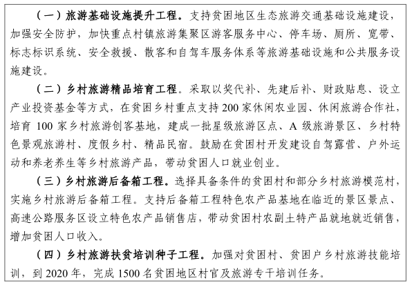 加快實(shí)施鄉村旅游項目。支持貧困縣開(kāi)發(fā)優(yōu)質(zhì)旅游資源,重點(diǎn)支持貧困縣鄉村旅游扶貧示范項目建設,通過(guò)因地制宜規劃旅游開(kāi)發(fā)項目,開(kāi)發(fā)具有競爭優(yōu)勢的旅游產(chǎn)品,吸引外來(lái)投資,與貧困戶(hù)建立緊密利益聯(lián)結機制。加強旅游基礎設施及配套服務(wù)設施建設,實(shí)施休閑農業(yè)與旅游基礎設施提升工程、鄉村旅游精品培育工程、鄉村旅游后備箱工程等一批旅游扶貧重點(diǎn)工程。