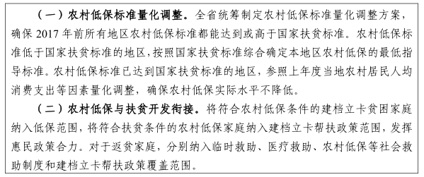 完善農村最低生活保障制度。推進(jìn)最低生活保障制度與扶貧開(kāi)發(fā)政策有效銜接,對無(wú)法通過(guò)產(chǎn)業(yè)扶持和就業(yè)實(shí)現脫貧的家庭實(shí)行政策性兜底保障。建立低保標準與物價(jià)上漲掛鉤的聯(lián)動(dòng)機制,逐步提高補助標準,推進(jìn)農村低保標準與扶貧標準"兩線(xiàn)融合"。建立農村低保與扶貧開(kāi)發(fā)的信息共享平臺,實(shí)現動(dòng)態(tài)監測管理、工作機制有效銜接。