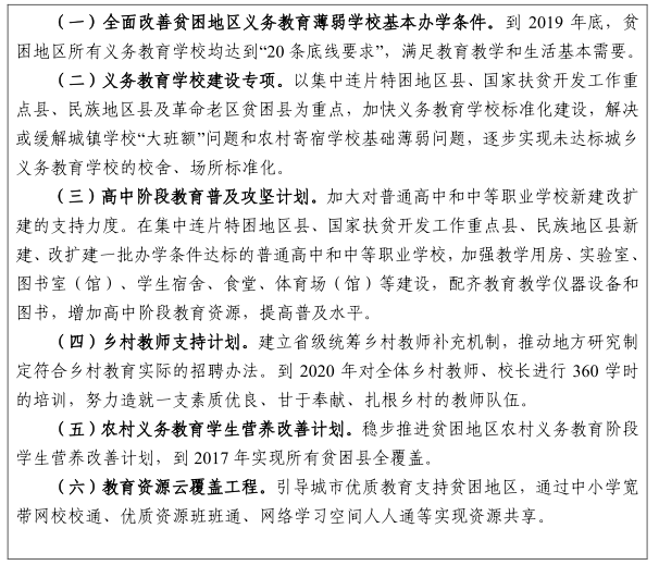 改善辦學(xué)條件。實(shí)施基礎教育鞏固提升計劃,合理布局貧困地區農村中小學(xué)校,全面改善貧困地區義務(wù)教育薄弱學(xué)?;巨k學(xué)條件,加強農村寄宿制學(xué)校建設,辦好確需保留的村小學(xué)和教學(xué)點(diǎn),建立城鄉統一、重在農村的義務(wù)教育經(jīng)費保障機制。到2018年,完成"全面改薄",2020年徹底改善7000多所非完全小學(xué)和教學(xué)點(diǎn)的基本辦學(xué)條件。切實(shí)推進(jìn)農村公辦幼兒園建設,不斷擴大學(xué)前教育覆蓋面。引導和鼓勵在人口較為集中的貧困村建設普惠性幼兒園,其他貧困村通過(guò)鄉鎮中心幼兒園辦分園、小學(xué)附設學(xué)前班,建立巡回支教點(diǎn)、社會(huì )力量辦園等方式發(fā)展學(xué)前教育,優(yōu)先保障貧困家庭適齡兒童接受學(xué)前教育。