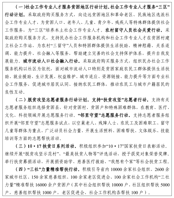 大力支持志愿者扶貧。實(shí)施脫貧攻堅志愿者服務(wù)行動(dòng)計劃。構建扶貧志愿者服務(wù)網(wǎng)絡(luò ),充分發(fā)揮各類(lèi)志愿服務(wù)組織的職能作用,針對貧困村、貧困戶(hù)和困難群體的不同情況和需求,開(kāi)展教育、醫療、文化、科技等志愿服務(wù)專(zhuān)項行動(dòng)。鼓勵支持專(zhuān)業(yè)技術(shù)人員、退休人員和社會(huì )各界人士參與扶貧志愿者行動(dòng),不斷壯大志愿者隊伍,提升志愿服務(wù)水平。