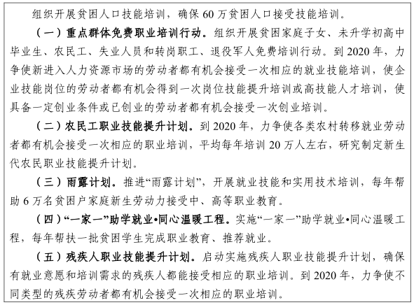 開(kāi)展職業(yè)教育扶貧協(xié)作。實(shí)施中等職業(yè)教育協(xié)作計劃,支持建檔立卡貧困家庭初中畢業(yè)生到省外經(jīng)濟較發(fā)達地區接受高質(zhì)量的中職教育。支持東部地區職業(yè)院校對口支援我省貧困地區職業(yè)院校建設,鼓勵各市州職業(yè)院校對口支援或指導貧困縣職業(yè)學(xué)校建設。引導企業(yè)扶貧與職業(yè)教育相結合,鼓勵相關(guān)行業(yè)優(yōu)質(zhì)企業(yè)到貧困地區舉辦職業(yè)教育,建設實(shí)訓基地。