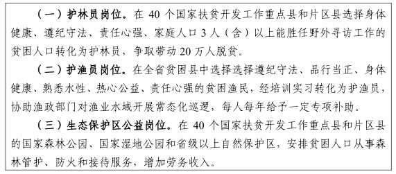 支持在貧困縣以政府購買(mǎi)服務(wù)或設立生態(tài)公益崗位的方式,以森林、草原管護為重點(diǎn),讓貧困戶(hù)中有勞動(dòng)能力的人員參加生態(tài)管護工作,充實(shí)完善國家公園的管護崗位,增加省級以上自然保護區、國家公園周邊貧困人口參與巡護和公益服務(wù)的就業(yè)機會(huì )。