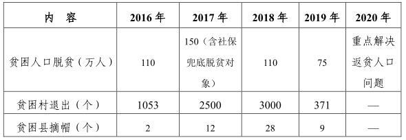 貧困縣全部摘帽。貧困縣農民人均可支配收入增速高于全省平均水平,縣域內基礎設施明顯改善,基本公共服務(wù)能力和水平進(jìn)一步提升,全面解決出行難、上學(xué)難、就醫難等問(wèn)題,社會(huì )保障實(shí)現全覆蓋,縣域經(jīng)濟發(fā)展壯大,生態(tài)環(huán)境有效改善,可持續發(fā)展能力不斷增強。貧困縣摘帽當年,貧困發(fā)生率降至2%以下,農民人均可支配收入2017年達到8000元,2020年達到10000元(其他年份按比例測算),易地扶貧搬遷任務(wù)完成率、貧困村退出率達95%以上。