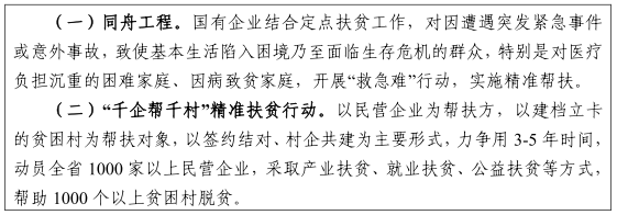 推進(jìn)企業(yè)精準扶貧行動(dòng)。動(dòng)員國有和民營(yíng)企業(yè)到貧困地區投資興業(yè)。大力開(kāi)展"萬(wàn)企聯(lián)村"、村企共建、"萬(wàn)企幫萬(wàn)村"等企業(yè)精準扶貧行動(dòng),深入推進(jìn)企業(yè)定點(diǎn)幫扶貧困革命老區縣、貧困少數民族縣,幫助加快實(shí)施一批村內道路、小型農田水利等設施建設。動(dòng)員國有企業(yè)積極承擔包村幫扶等扶貧開(kāi)發(fā)任務(wù)。充分發(fā)揮工商聯(lián)的橋梁紐帶作用,引導民營(yíng)企業(yè)參與扶貧開(kāi)發(fā)。