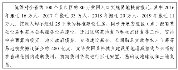 組織實(shí)施好易地扶貧搬遷工程,確保搬遷群眾住房安全得到有效保障,安全飲水、出行、用電、通訊等生活需要得到基本滿(mǎn)足,享有便利可及的教育、醫療等基本公共服務(wù),遷出區生態(tài)環(huán)境明顯改善,安置區特色產(chǎn)業(yè)加快發(fā)展,收入水平不斷提高。到2020年,實(shí)現約80萬(wàn)貧困人口搬得出、穩得住、能脫貧。