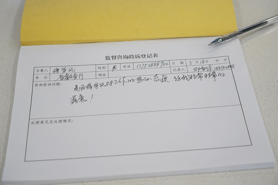 5月18日,收到補辦好的證明書(shū),鄧雪華專(zhuān)程來(lái)大廳寫(xiě)下“好評”。