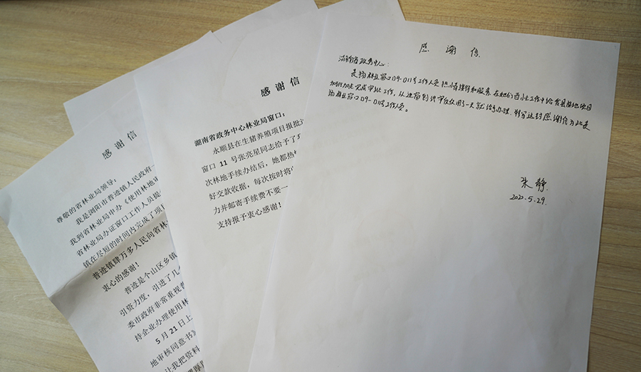林業(yè)窗口的審批辦公桌一角,隨意擺放著(zhù)一沓感謝信,辦事員們對此已經(jīng)習以為常。