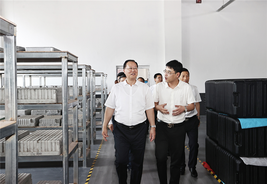 毛偉明在湖南歐騰箱包公司調研。