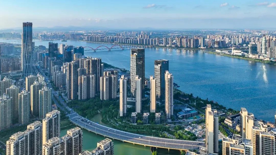 湖南金融中心在藍天白云映襯下美如畫(huà)卷。