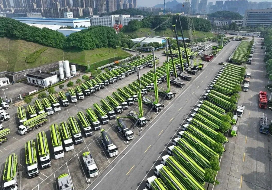 中聯(lián)重科麓谷工業(yè)園,各類(lèi)工程機械產(chǎn)品一字排開(kāi)。