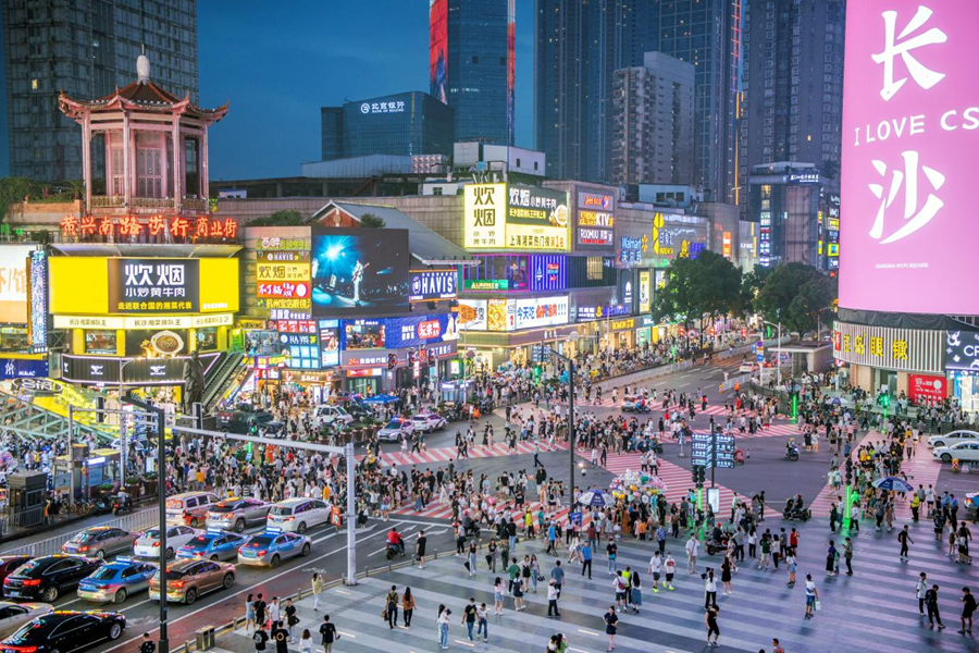長(cháng)沙市五一商圈人潮涌動(dòng),熱鬧非凡。