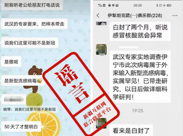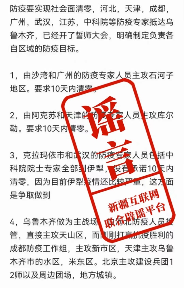 有網(wǎng)民在微信群組、微博、今日頭條等平臺以短視頻、圖片、文字等形式散布“從今天開(kāi)始,新疆本地核酸檢測機構不參與檢測,全部由內地的檢測機構檢測......”“河北、天津、成都、武漢、江蘇、中科院等防疫專(zhuān)家抵達烏魯木齊,已經(jīng)開(kāi)了誓師大會(huì ),明確制定負責各自區域的防疫目標......”等虛假信息及類(lèi)似變種樣本,經(jīng)與有關(guān)部門(mén)核實(shí)查證,上述信息均為網(wǎng)絡(luò )謠言。